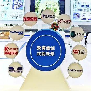神州信息联合龙芯中科、清华同方、统信软件、麒麟软件、金山WPS、永中软件、极域软件和极坐标软件共同组团,以“教育信创,共创未来”为主题联合参展,全面复刻、分享与推广金华市近三年内在教育领域探索与推进信创工作的成果和心得。