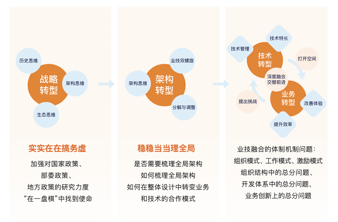 数字化转型应当是自上而下的,所以首先应该是战略转型,毕竟转型要集中大量的资源去推动,必须要先成为企业战略,才能调动企业的全部力量;接着应该是架构转型,数字化转型与以往企业转型的不同之处,主要在于数字化技术要发挥更大的作用,因此,必须先在管理层面实现业技融合,用企业架构的思路沿着这一方向完成架构转型,使战略过渡到对实际工作的指导;最后,就是继续推动技术转型和业务转型,促进业技融合。