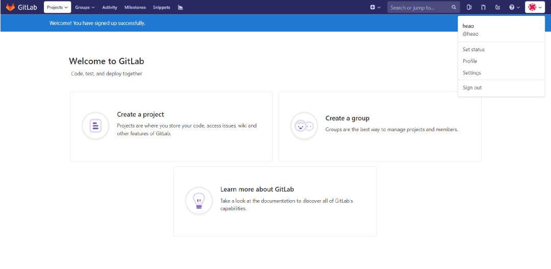 填写用户注册表单提交后新用户注册成功,自动跳转到GitLab主页面: