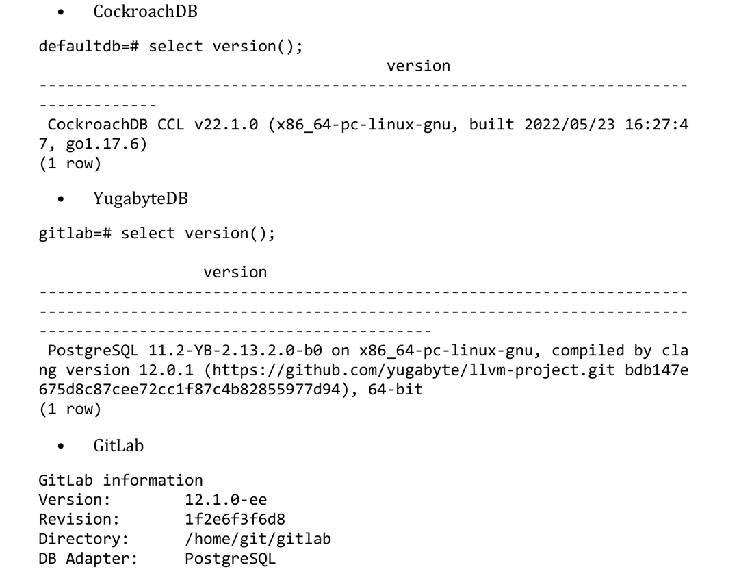CockroachDB说支持绝大多数的PG语法,YugabyteDB说支持所有的PG特性,本系列测评文章用于对比这两款数据库对GitLab的支持程度如何,一定程度上能反映出对标准PostgreSQL的兼容情况。