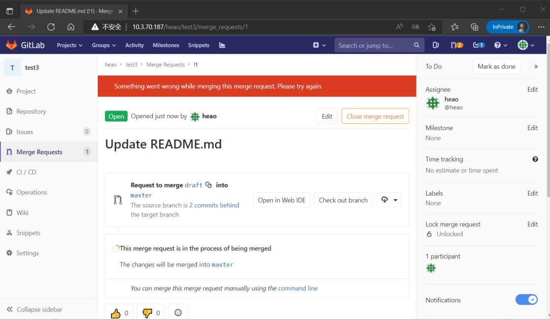对比结果:CockroachDB和YugabyteDB出现相同的情况:提交Merge请求后持续加载中,一段时间后页面出现报错提示,无法再次提交merge,日志无异常。