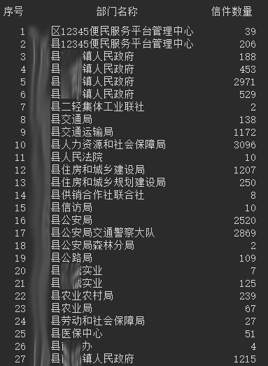 我们初步探索了数据,对部门信件总数统计如下(部分):