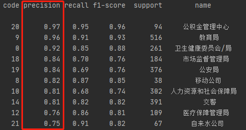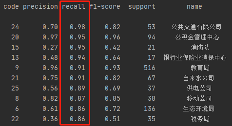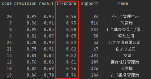 我们可以看到模型在信件分类中的查准率、查全率以及F1分数上都有较好的表现,特别是公积金中心、教育局、卫健委/局、移动公司、公交公司、公安局、市场监管局、人社局、医保局、交警等重要部门的信件,模型的分类效果均达到或超出预期。