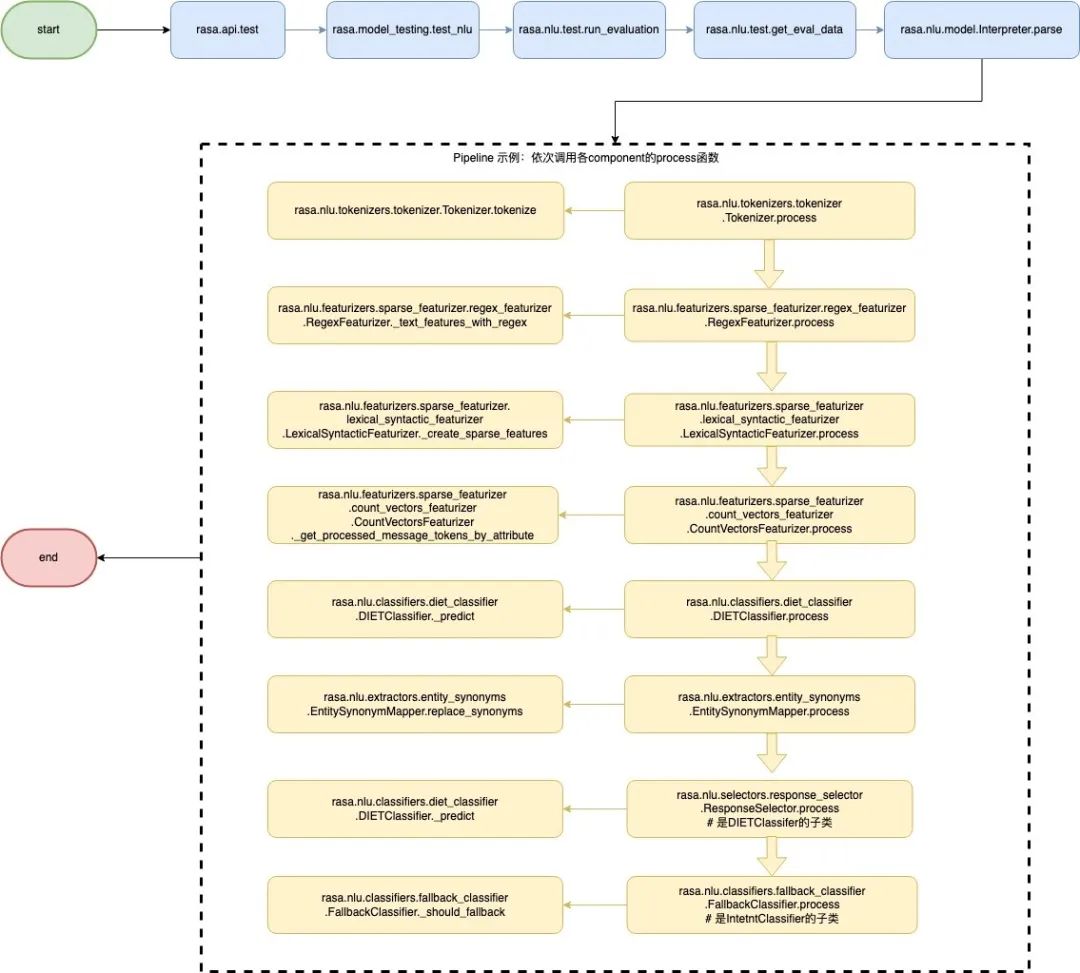 每个component都有一个process入口方法,用于测试和实际预测,在process方法中再调用各component的内部方法(包含真正的处理逻辑),上图虚线框中即展示了一个基本的pipeline预测示例。