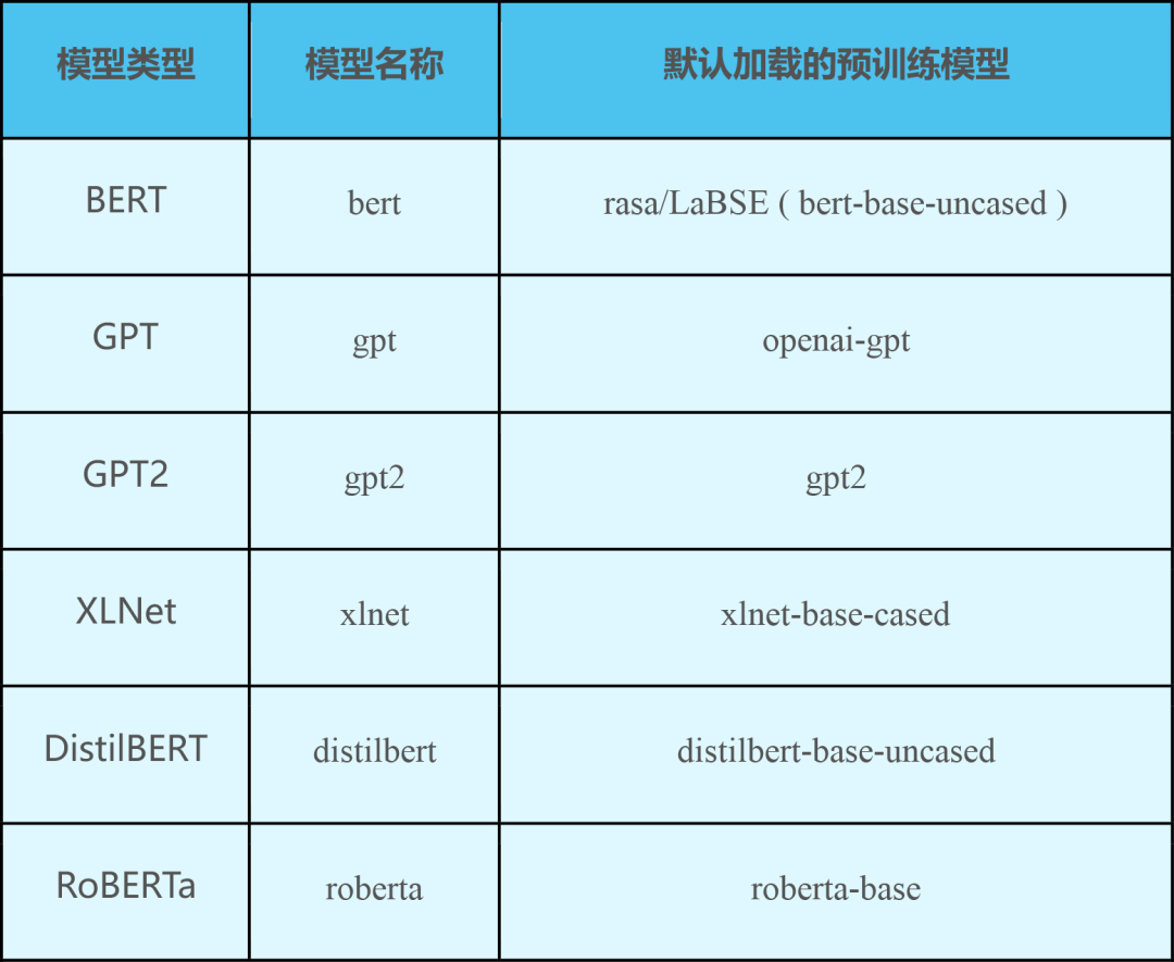 对在HuggingFace 中上传的所有预训练模型(Huggingface模型列表),Rasa DIET可以支持满足以下条件的所有模型:
