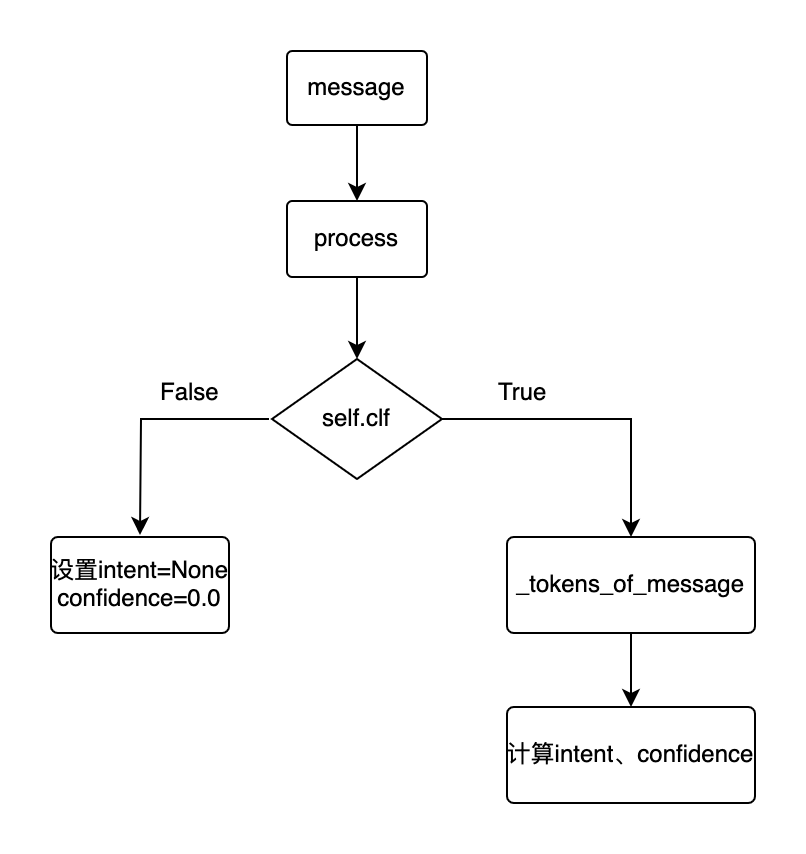 ●判断分类模型是否存在,若不存在则设置intent为None,confidence为0,否则,把message转成token,然后计算intent,confidence,并设置到message中