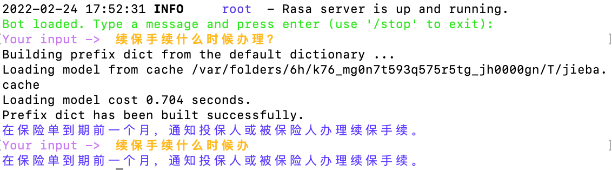 ●Rasa Core:主要负责对话管理。根据NLU输出的信息、以及Tracker记录的历史信息,得到上下文的语境,从而预测用户当前步最可能执行哪一个action。